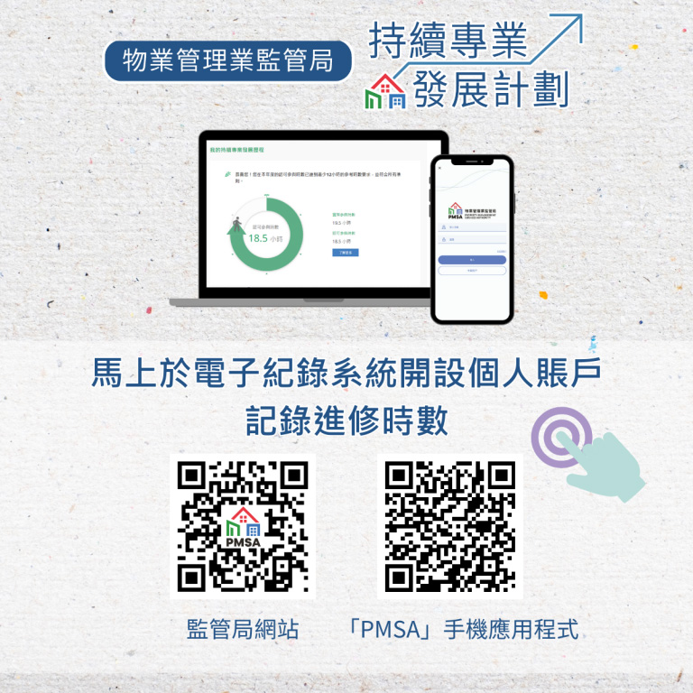 為方便物管人牌照持有人隨時查閱和管理自己參與持續專業發展活動/課程的紀錄,監管局早前推出了「計劃」電子紀錄系統。物管人牌照持有人可透過監管局網站「PMSA」手機應用程式於系統開設個人賬戶,以記錄其參與持續專業發展活動/課程的資料和時數,而系統會透過簡單圖表清楚展示個人的學習進度是否已達到「計劃」的認可參與時數要求及符合所有準則。物管人牌照持有人亦可於系統搜尋和報名參加監管局舉辦的活動並繳付費用,非常方便。