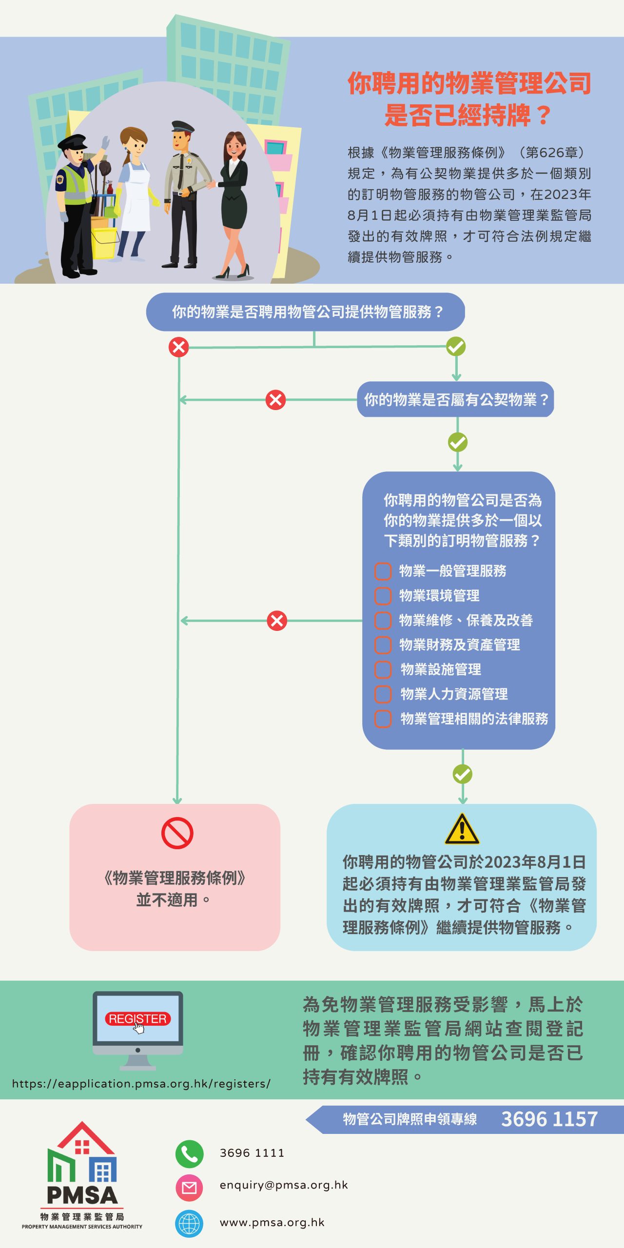 - 若你与所聘用的物管公司已签订有效期跨越2023年8月1日的物管服务合约,并就有关公司届时可能仍未持有牌照所引致的后果有疑问及表示关注,应尽早与相关物管公司联络作出查询,及如有需要寻求专业意见,并作出适当跟进安排。