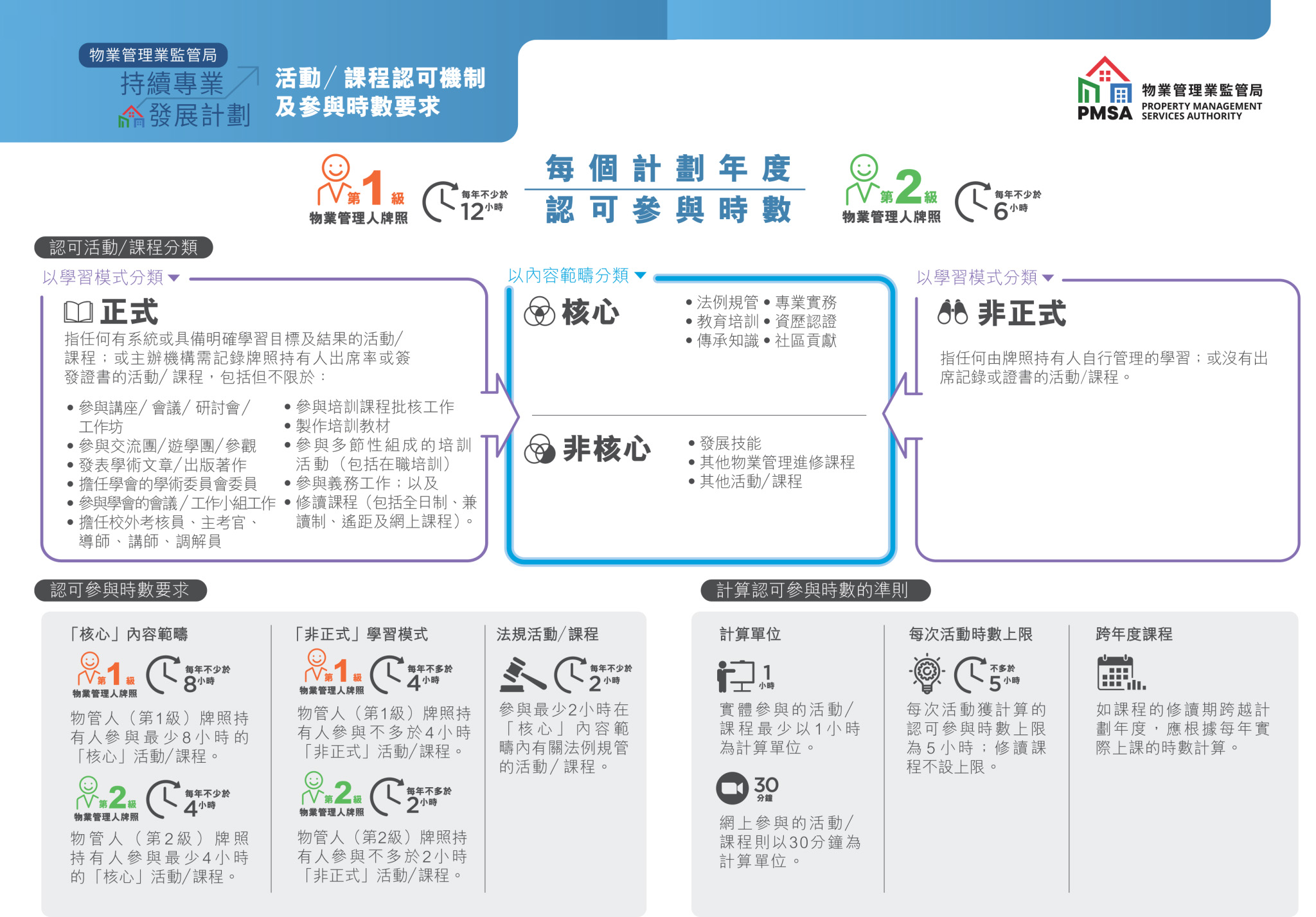 在强制参与安排下,「持续专业发展计划」会维持以「历年」(即每年1月1日起至12月31日)作为周年单位,而物管人(第1级)及(第2级)牌照持有人每年分别参与不少于 12 及 6 小时符合计划要求的持续专业发展活动/课程的要求会维持不变。监管局会于每个历年结算牌照持有人参与持续进修的认可参与时数。