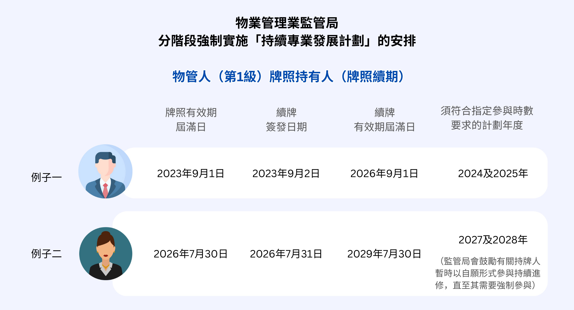 发牌制度三年过渡期尚有20天便会完结,为迎接相关物管公司及物管从业员均须持牌朝优质化专业化发展的物管新世代,监管局将由今年8月1日起,强制实施「持续专业发展计划」,分阶段向不同级别的物管人牌照持有人强制要求参与持续进修。物管人(第1级)牌照持有人会由 2024 年 1 月 1 日起须强制参与「持续专业发展计划」;而物管人(第2级)牌照持有人则由2025年1月1日起须强制参与。