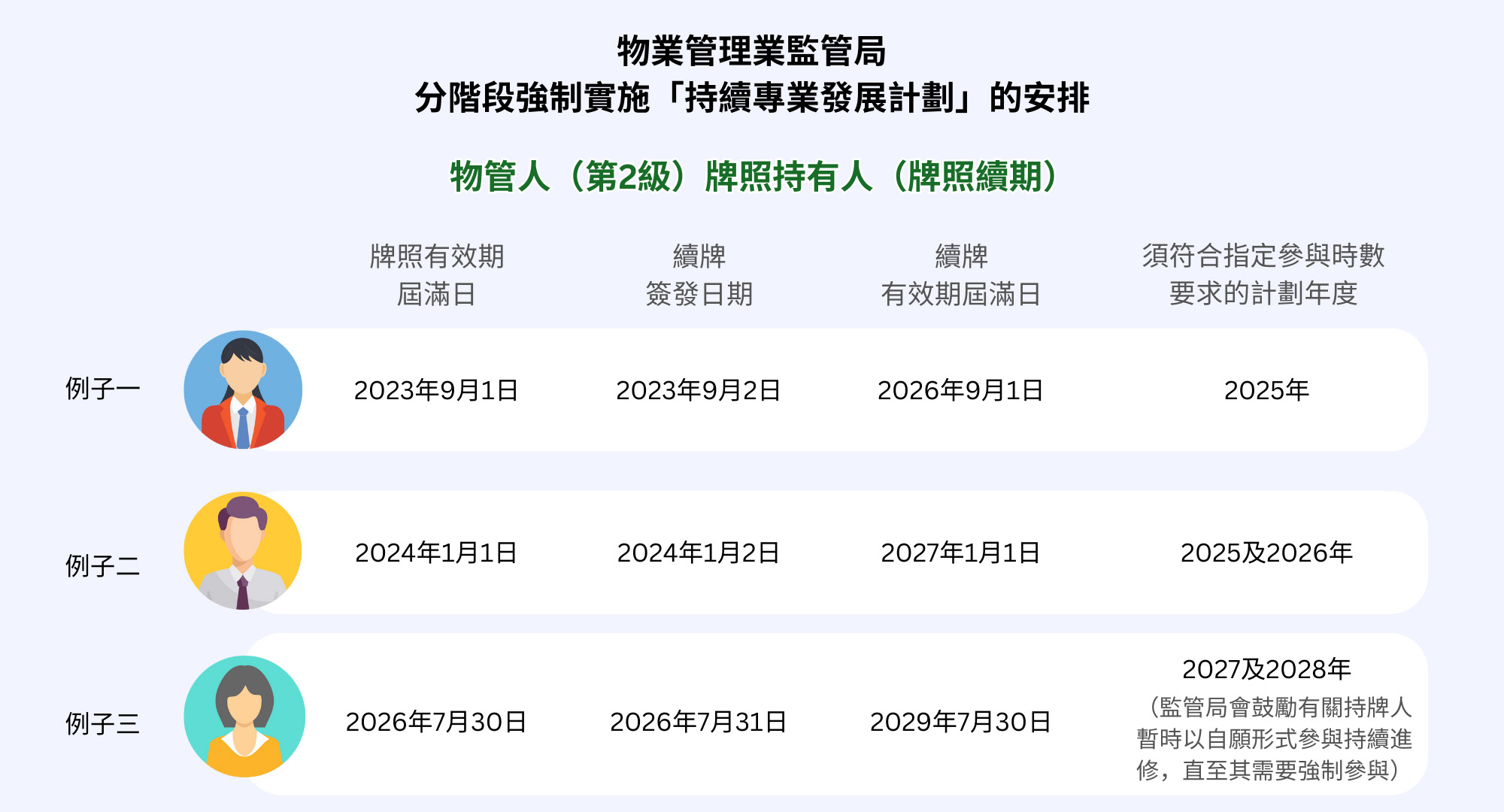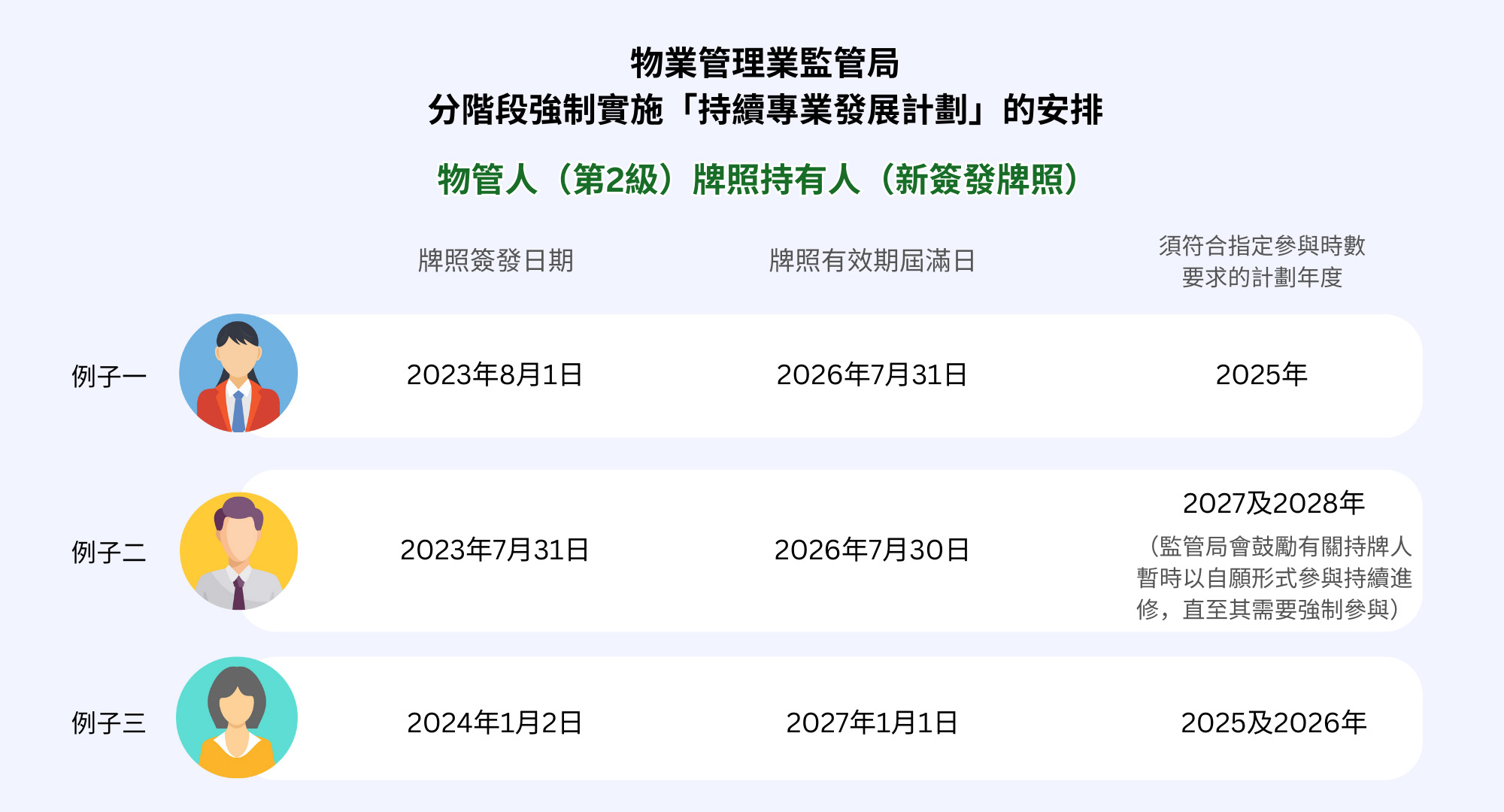 至于物管人(第2级)牌照持有人,由于强制参与的生效期由2025年开始,故监管局会就所有由今年 8 月 1 日至 12 月 31 日期间新签发及续期的物管人(第2级)牌照(3年有效期)施加条件,要求相关持牌人在牌照有效期届满之年(即 2026 年)起计的上一个「持续专业发展计划」年度(即 2025 年),须符合计划指定的参与时数要求(即不少于6小时);而由 2024 年起新签发及续期的物管人(第2级)牌照(3年有效期),监管局则会施加条件要求相关持牌人在牌照有效期届满之年(即2027年或以后)起计的上两个「持续专业发展计划」年度,均须符合计划每年指定的参与时数要求(即不少于6小时)。