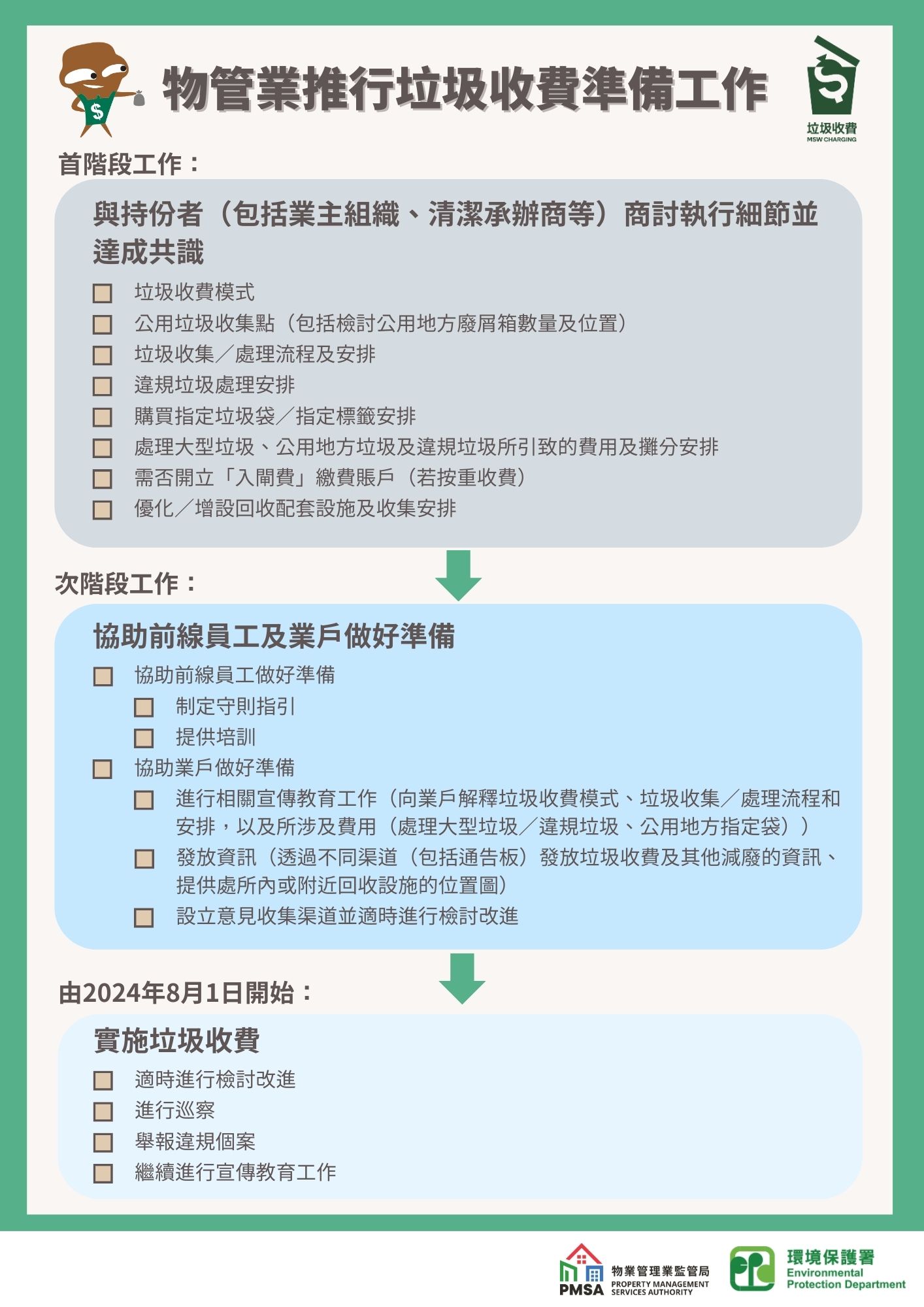 進行相關宣傳教育工作(向業戶解釋垃圾收費模式、垃圾收集/處理流程和安排,以及所涉及費用(處理大型垃圾/違規垃圾、公用地方指定袋))